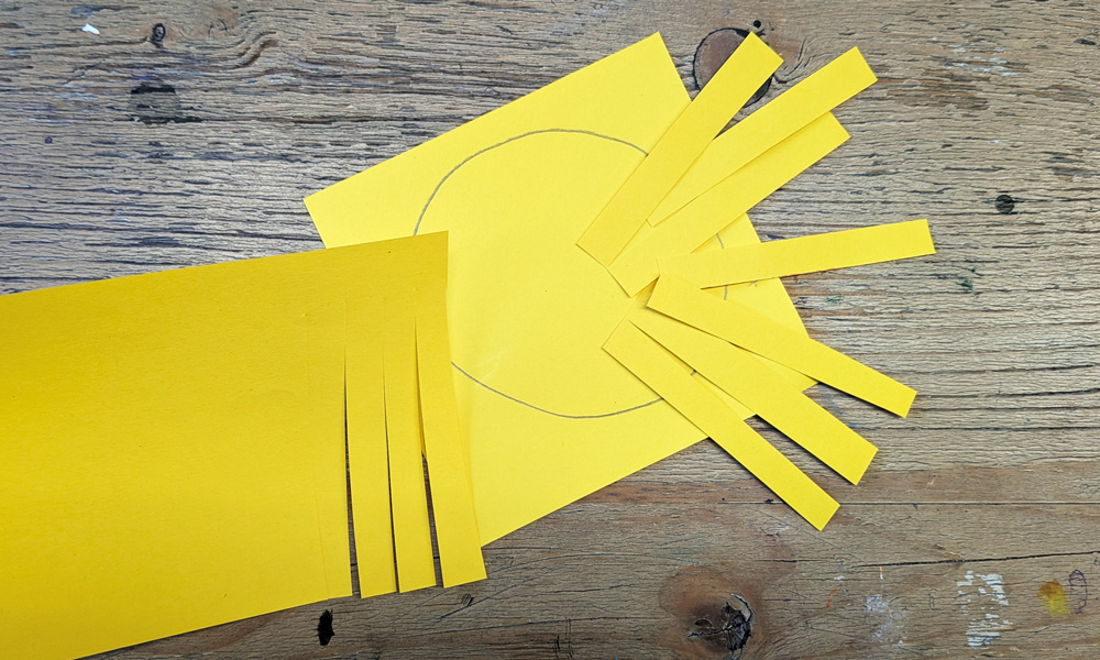 - Dann das zweite gelbe Quadrat in schöne schmale Streifen schneiden. Hier muss man nichts vorzeichnen, aber darauf achten, dass die Streifen nicht zu breit sind (allerdings auch nicht zu schmal).